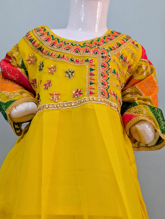 Girls yellow organza fully embroidered maxi with yellow silk trouser and gold dupatta