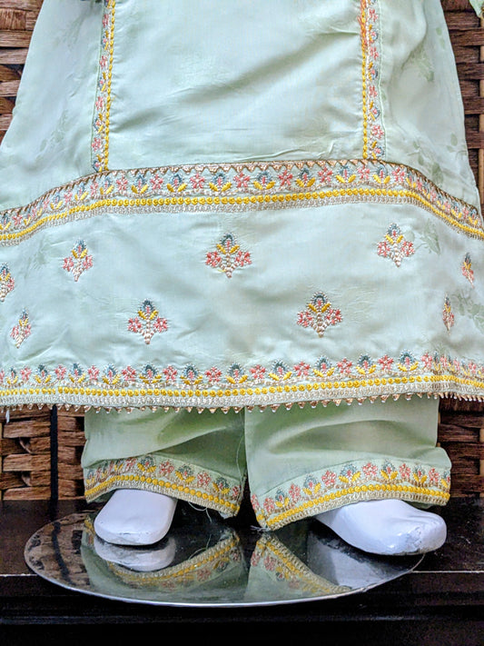 Girls seafoam green self print and fully embroidered cotton air line shirt with loose pants