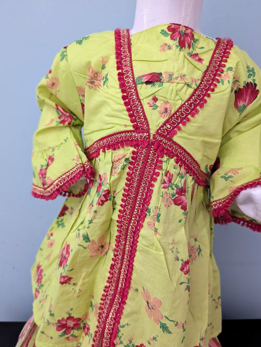 Girls' green printed and lace work cotton lawn frock with printed gharara style pants.