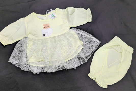 Girls' yellow silk embroidered frock with soft inner and matching yellow and gold gharara.