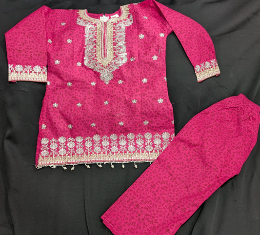 Girls' cotton dress with full mirror work embroidery and matching pants.