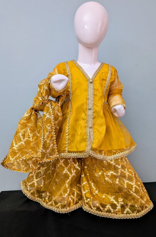 Girls mustard and dark green contrast crushed gharara set (sleeves included but not attached)