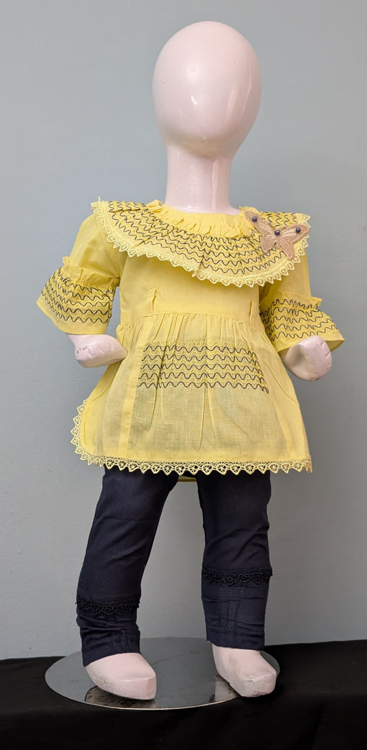 Girls light yellow printed and lace work cotton lawn frock with printed gharara style pants