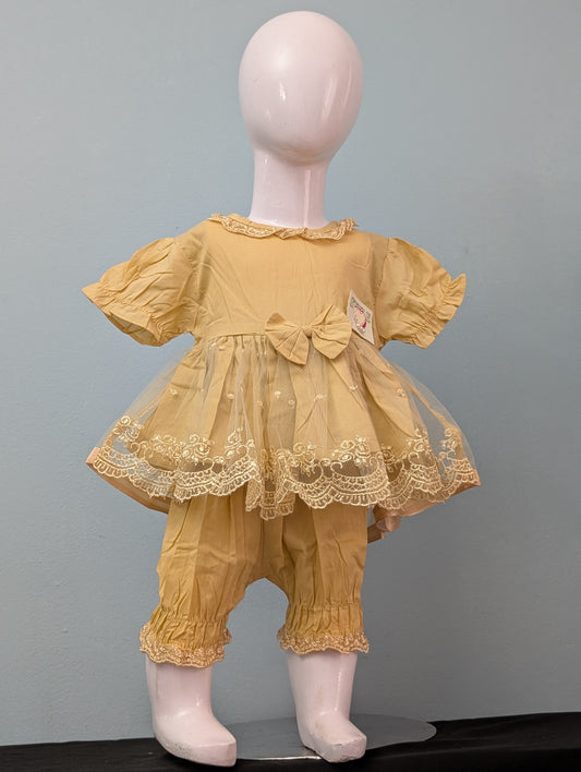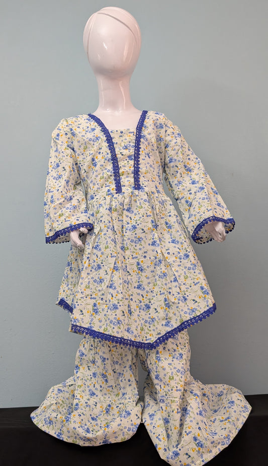 Girls lawn floral summery peplum frock with gharara style pants and yellow dupatta