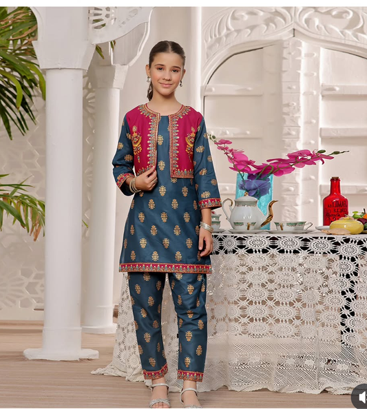 Girls light turquoise fully embroidered lawn kurta with matching trouser