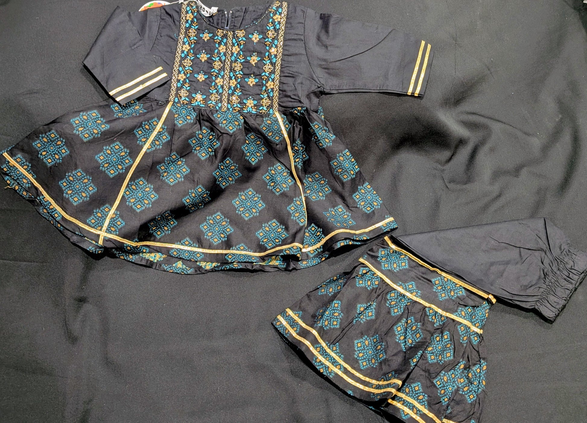 Girls' cotton self-printed embroidered and gotta work frocks and gharara sets (available in two colors).