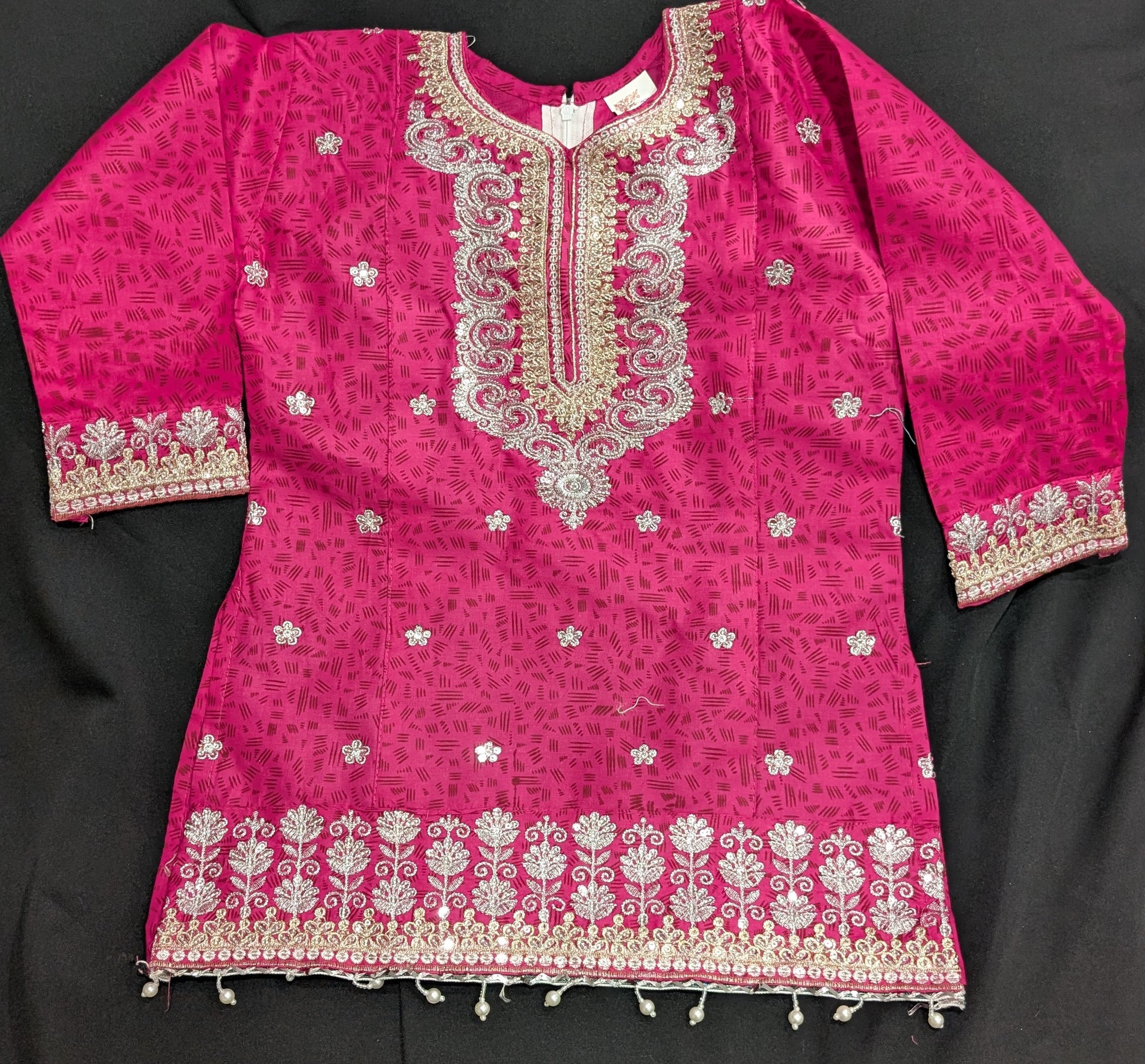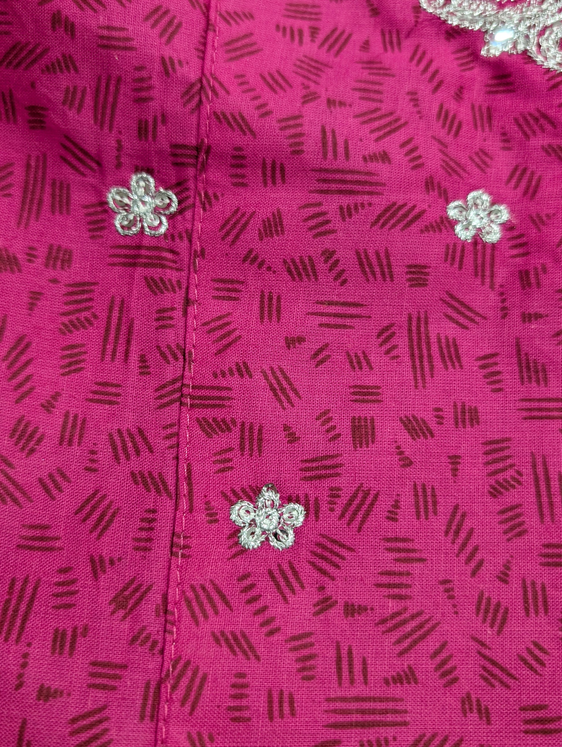 A girls' pink cotton kurta featuring a self-print and embroidery, paired with matching pants and a net dupatta.